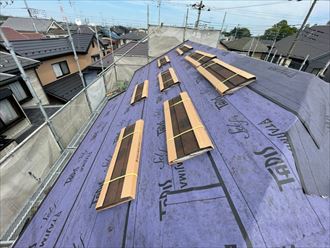 さらに既存の屋根へ新しい防水紙(ルーフィング)を設置していきます。防水紙は、万が一水が流れても下には回り込まむように設置されます。今回使った防水紙は、遅延粘着型で作業性が良いです。施行から2時間で強い粘着・防水性を発揮してくれます