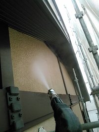 高圧洗浄は、外壁や屋根の塗装面にこびりついたカビや汚れを高圧の水流によって洗い落として、塗料の接着をよくするために行います。